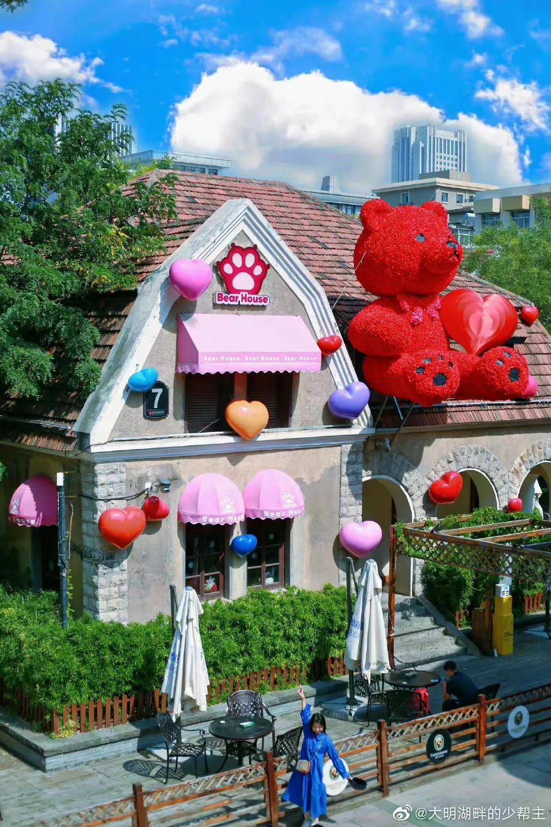 憨态可掬的红色小熊手捧爱心稳稳地坐在房檐上,似乎在欢迎着来这里的人们,果然浪漫还得看老商埠。