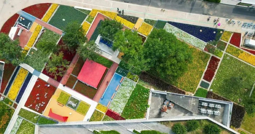 从高空俯瞰,整个公园分成一个个方格,不同品种的花卉组成了一块彩色的世界,在阳光下分外耀眼,简直美到犯规!