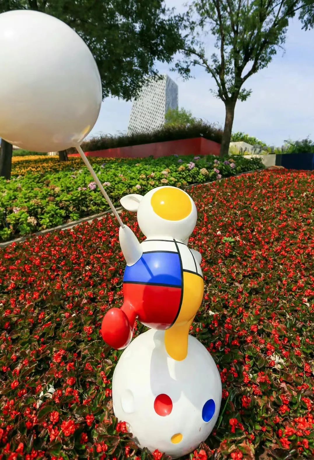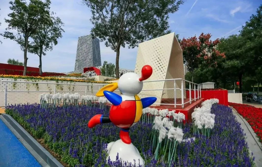 走进花田,淡紫的薰衣草随着秋风摇曳,多种颜色的菱形遮阳亭和座椅错落有致,艺术化设计的玩偶造型雕塑点缀其间,令人目不暇接。