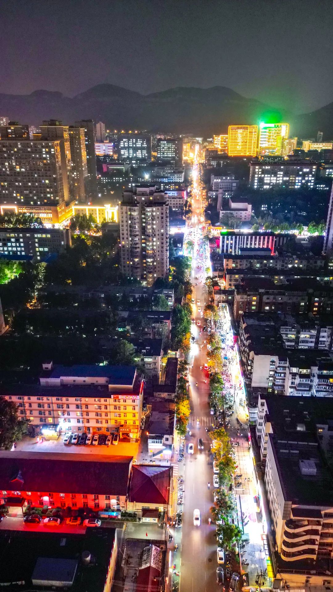 俯瞰而去,周边的车流留下光影的痕迹,将夜晚的泉世界映得灯火通明,好似正在举办一场绚丽的灯光秀。