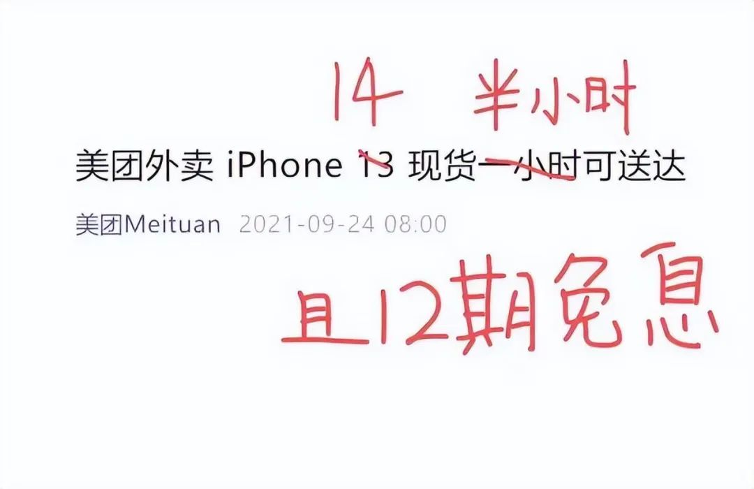 美团在iPhone配送这场大战上,宣称“买iPhone 14现货最快半小时可送达,且享12期免息”。同时,美团外卖在全国200多个城市,拥有超1110家Apple授权专营店。