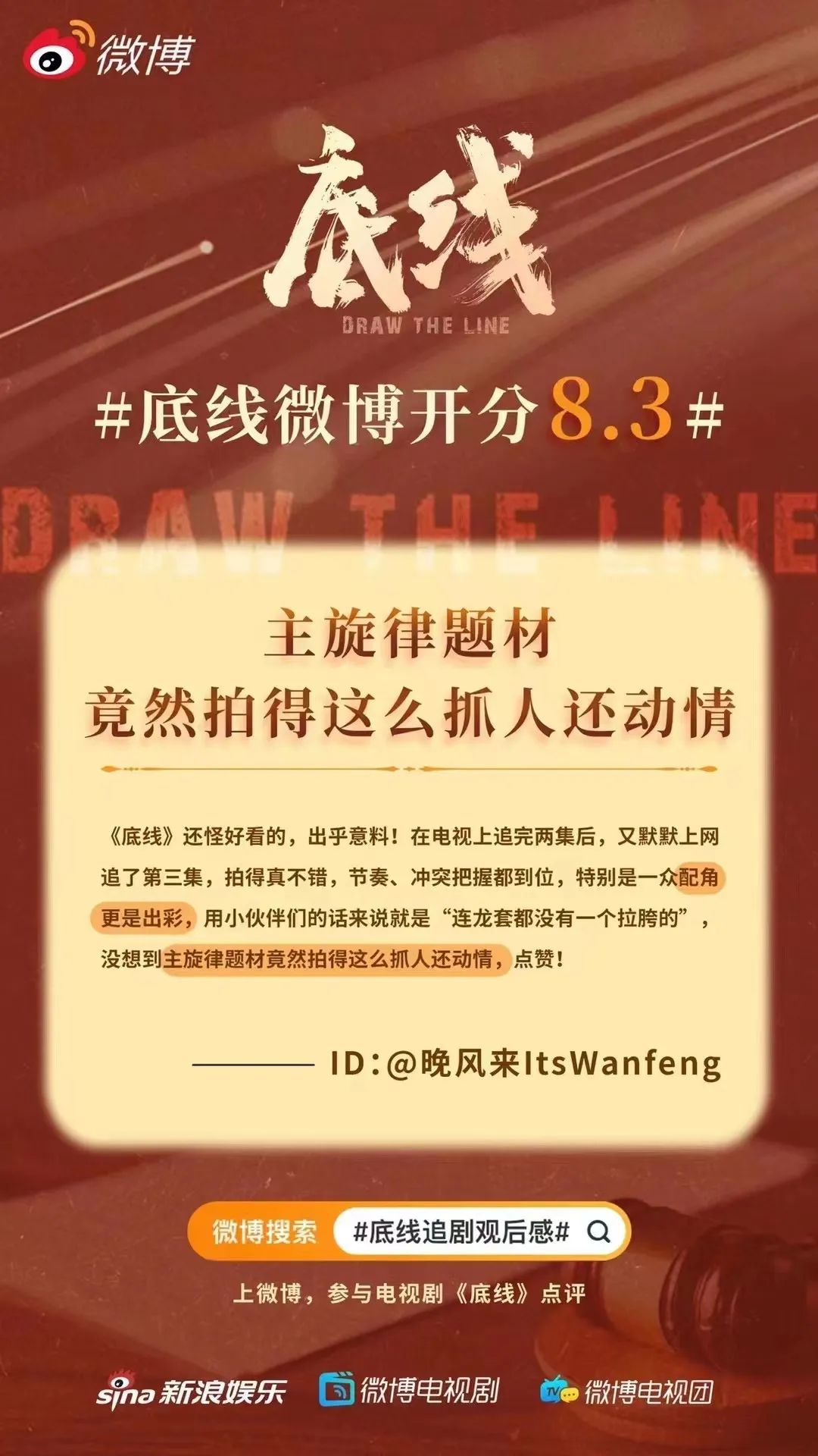 9月27日,#国产法律剧终于支棱起来了#话题登上了微博热搜第一,《底线》获得了观众的一致好评!微博开分8.3,感谢大家的厚爱吖!