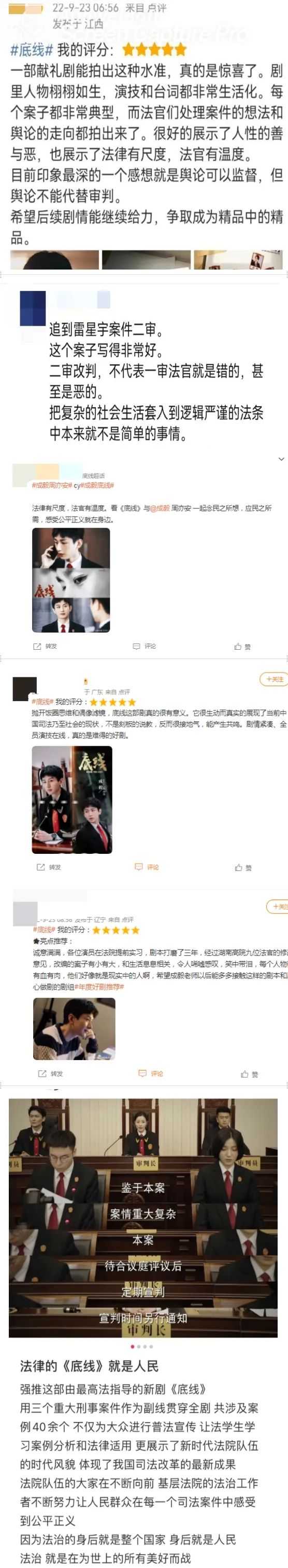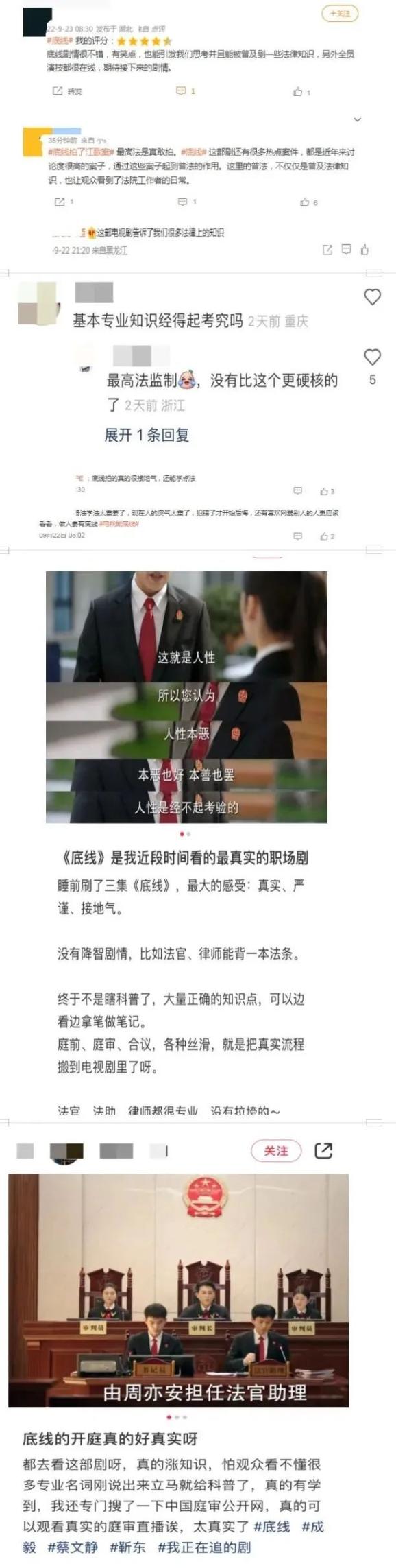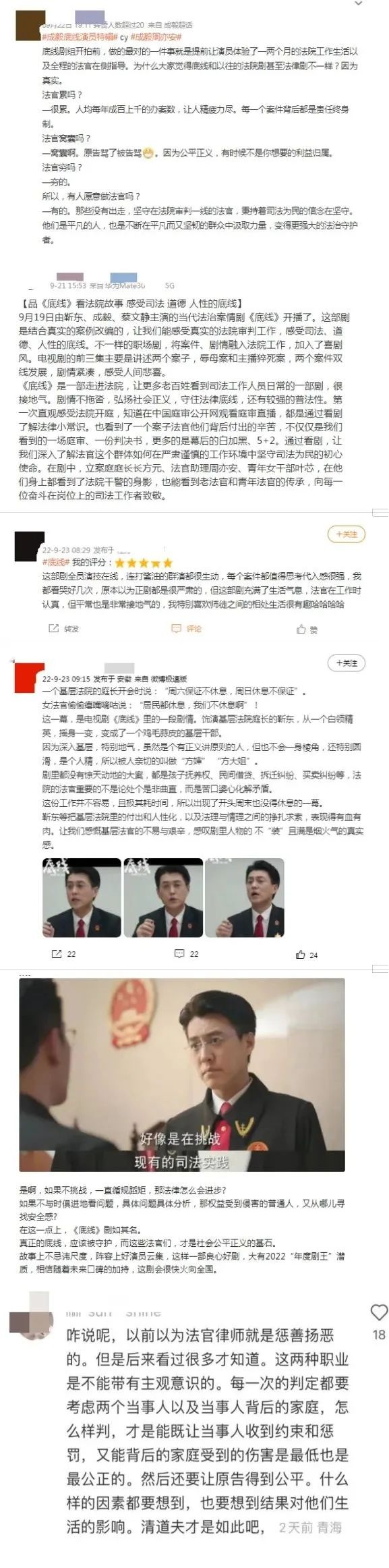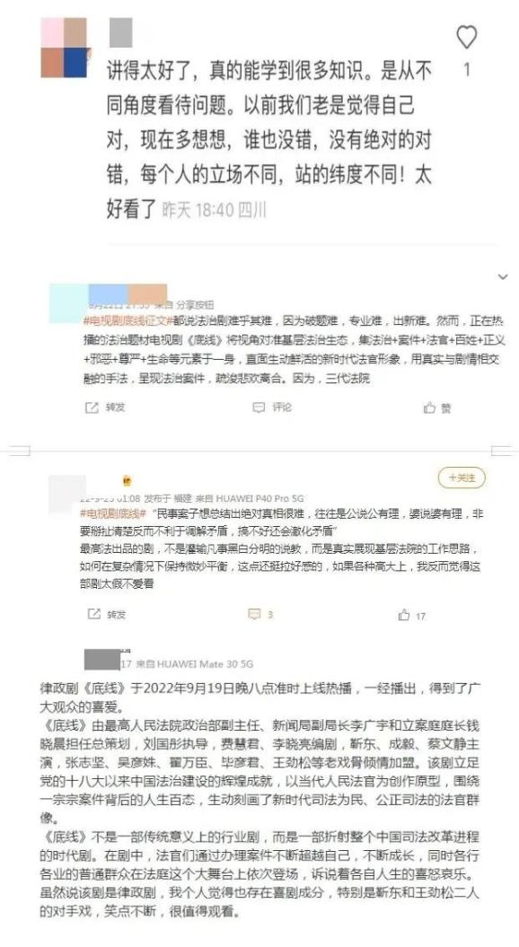 通过《底线》,我们不仅看到了一场场庭审、一份份判决书,更多的是看到了法官这个群体是如何在严肃谨慎的工作环境中,坚守司法为民的初心与使命。在剧中,立案庭庭长方远、法官助理周亦安、青年女干部叶芯,在他们身上看到了老法官和青年法官的传承,向每一位奋斗在岗位上的司法工作者致敬!