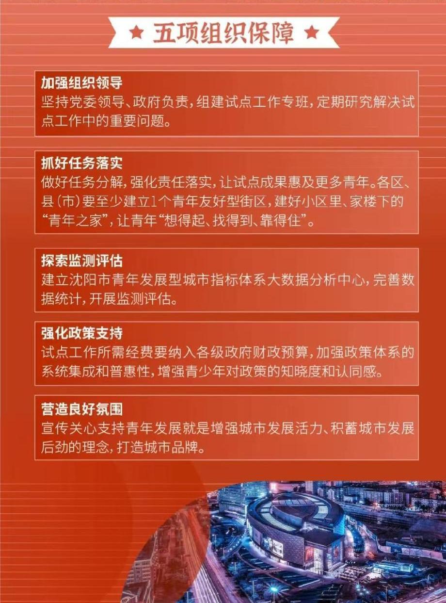 沈阳市委组织部牵头制发《打造青年友好型街区、建设人才成长型城市工作方案》,细化了七大项31个方面工作任务。统筹各具特色城区建设,出台《沈阳市青少年发展“十四五”规划》。