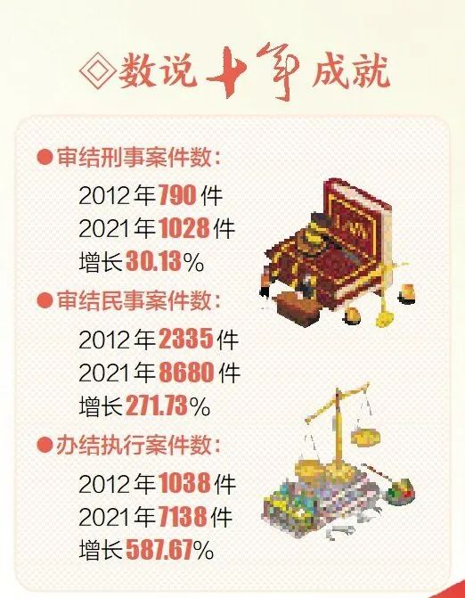强化主责主业,狠抓审判质效。执法办案始终是法院工作的第一要务。10年来,惠阳法院共审(执)结各类案件91002件,其中2012年结案4185件,2021年结案17449件,翻了三倍多。公正司法水平稳步提高,极大地回应了人民群众司法关切,用法治之光照亮人民幸福生活。