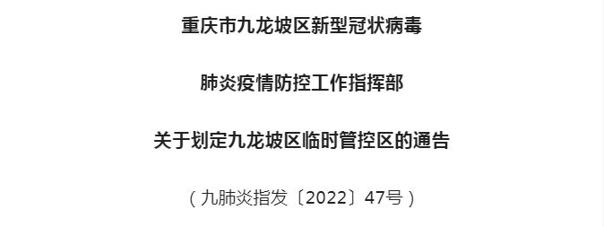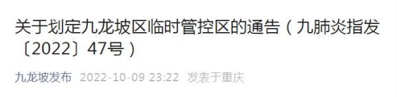 根据当前九龙坡区疫情防控工作需要,按照《新型冠状病毒肺炎防控方案(第九版)》相关规定,经区疫情防控工作指挥部研究决定,自2022年10月9日起,在辖区内划定临时管控区。具体如下:一、具体区域