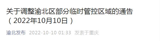 按照《新型冠状病毒肺炎防控方案(第九版)》相关规定,结合当前渝北区疫情防控工作需要,经市、区专家研判和渝北区新型冠状病毒肺炎疫情防控工作指挥部研究,并商两江新区新型冠状病毒肺炎疫情防控指挥部同意,决定自2022年10月10日1时起,对渝北区部分临时管控区域实施调整。现就有关事项通告如下:一、临时管控区域