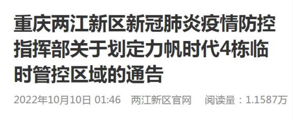 根据当前疫情防控工作需要,按照《新型冠状病毒肺炎防控方案(第九版)》相关规定,两江新区疫情防控指挥部决定,自2022年10月10日零时起,在辖区内划定临时管控区,具体如下:一、具体区域