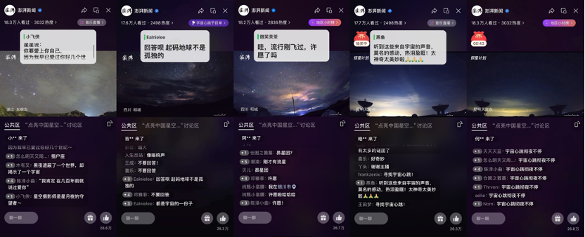 “探星计划”的三位主创成员,与星空摄影师、7位新锐音乐人一起,共同畅谈星空和脉冲星探索,对天文现象、脉冲星探测、科技探索宇宙进行公众科普,超过600万名观众在线感知脉冲星的心跳,聆听以AI探索宇宙的故事。在“最长的安可”,多地星空慢直播环节,众多网友在直播间观星和许愿,电台主播通过宇宙相关的音乐、电影、文学话题,将网友思绪引入太空。这场“安可”直到凌晨5点结束,来自脉冲星的“宇宙心跳”在直播间里彻夜不停。