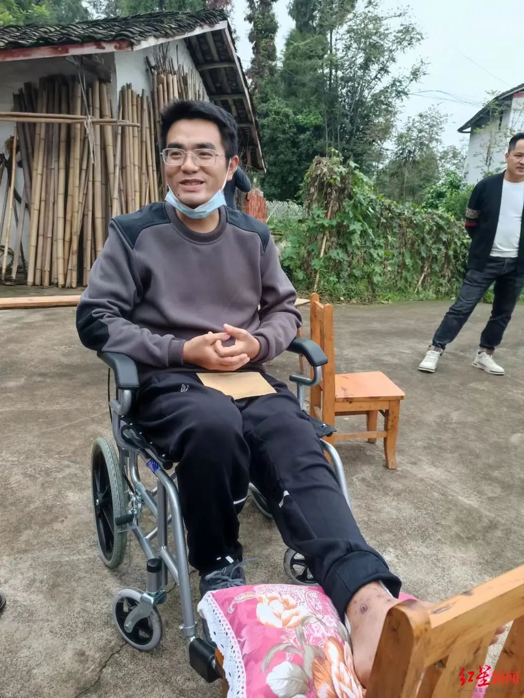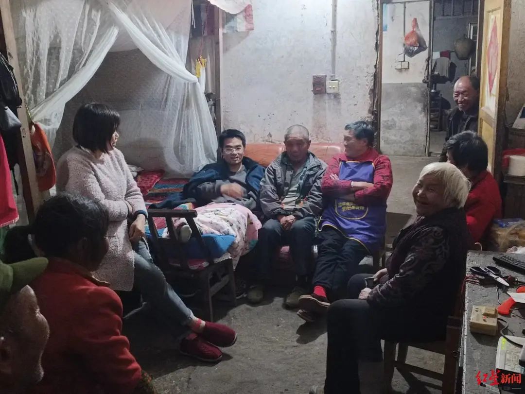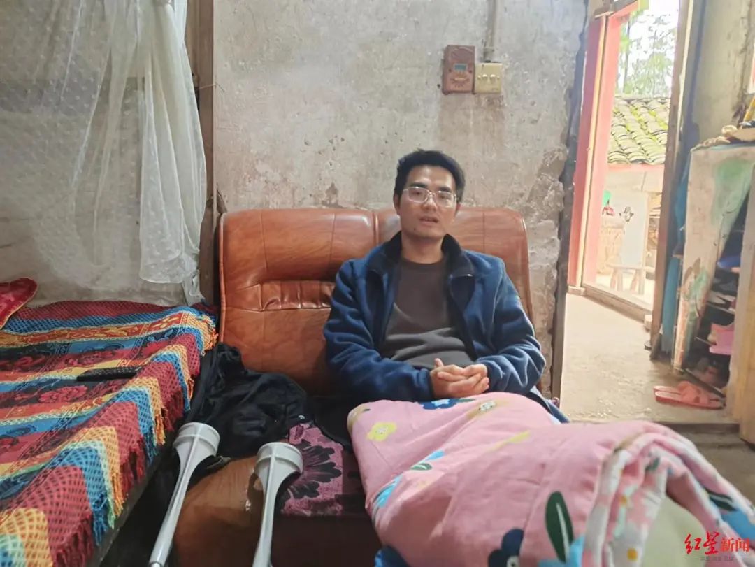 吃完晚饭,天渐渐黑下来,村子安稳而寂静。70多岁的大奶奶提着一钵醪糟来,另一个长辈提了一只大白鹅来……头天下午甘宇刚到家的时候,他们就在院坝里等着,吃完晚饭又聚到甘宇家中。甘宇靠在奶奶床前的旧沙发上,双脚抬起来搭在凳子上,腿上盖一张薄毯,受伤的左脚还肿着,下地还需拄两根拐杖。奶奶的房间挤了10来个人,都是村里长辈,甘宇看起来像个腼腆的大孩子,挨着招呼长辈,不时回应大家的关切……