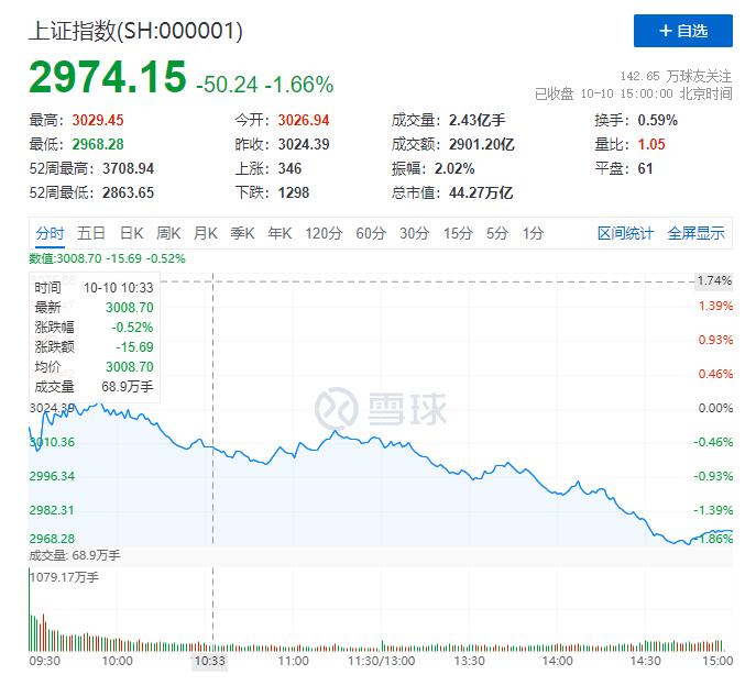 红星资本局消息,10月10日,国庆节后的首个交易日,A股市场震荡下行,上证指数午后跌破3000点。这是继今年4月25日之后,沪指第二次跌破3000点大关。