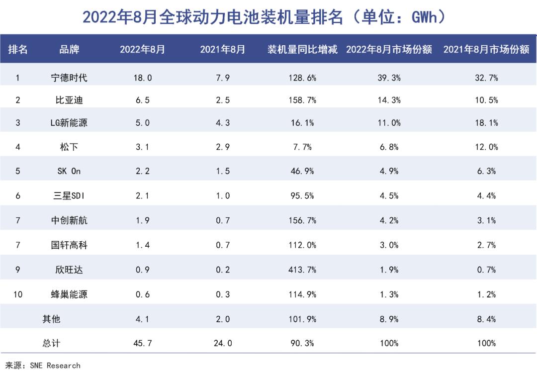 8月份,宁德时代的装机量甚至大于后四名的总和。