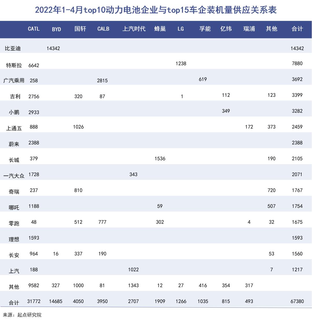 其与宁德时代的客户交叉者甚多,不过“二供”属性明显。根据起点研究院统计的2022年1-4月top10动力电池企业与top15车企装机量供应关系表中,中创新航的供应客户中,仅在广汽乘用车和零跑汽车中占据了较大的份额,在其他客户的使用份额都较为偏弱。