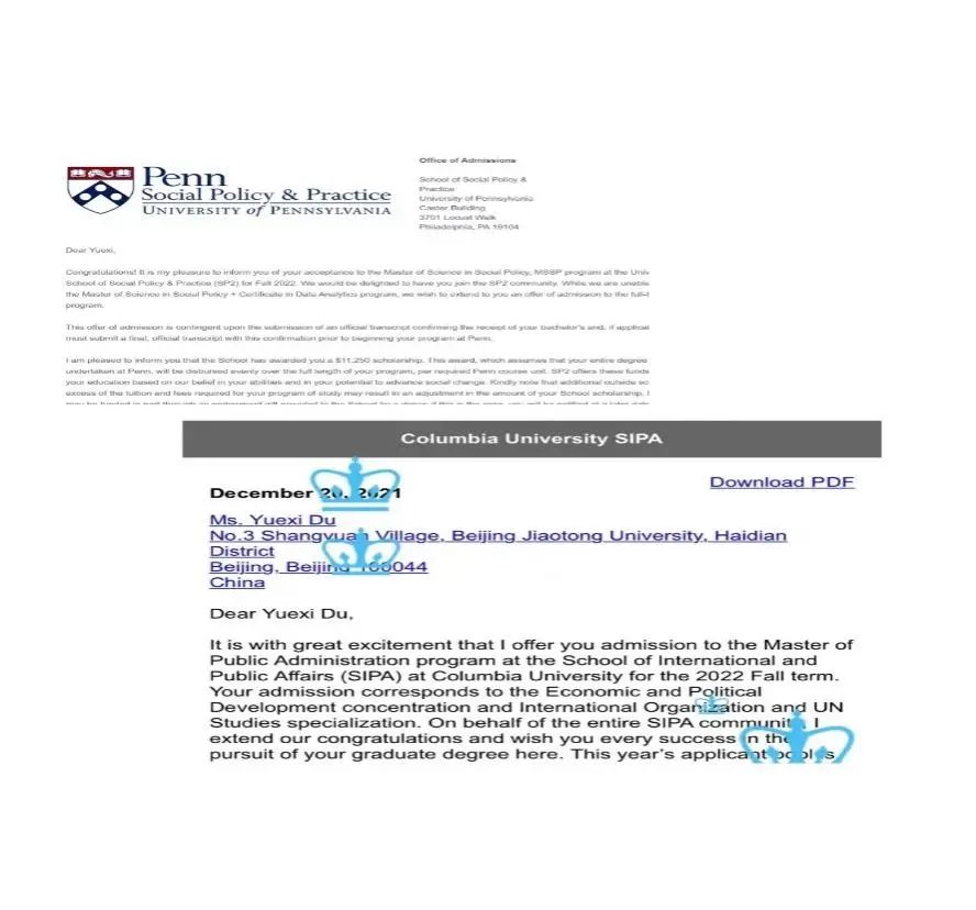 杜月曦获得哥伦比亚大学和宾夕法尼亚大学硕士项目录取。
