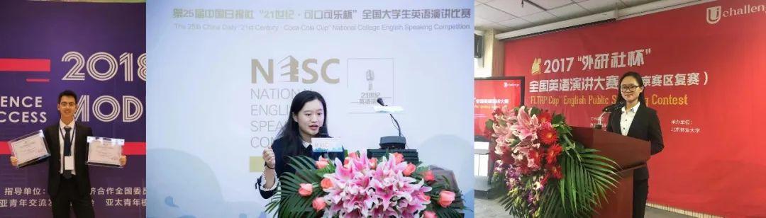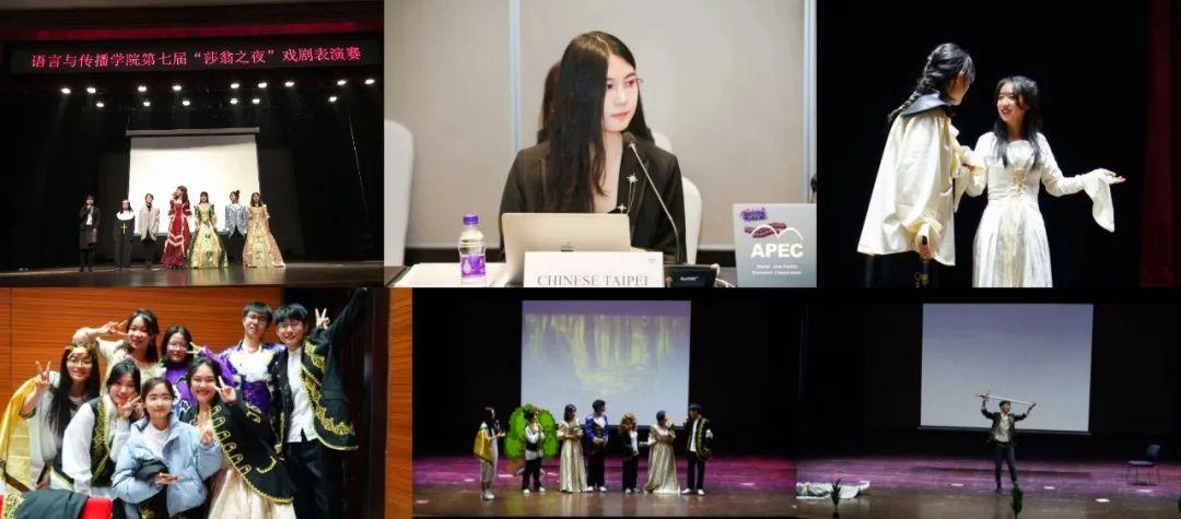 “英语交际、公共演讲、英式辩论、莎翁戏剧表演”,学生参与相关实践的照片。