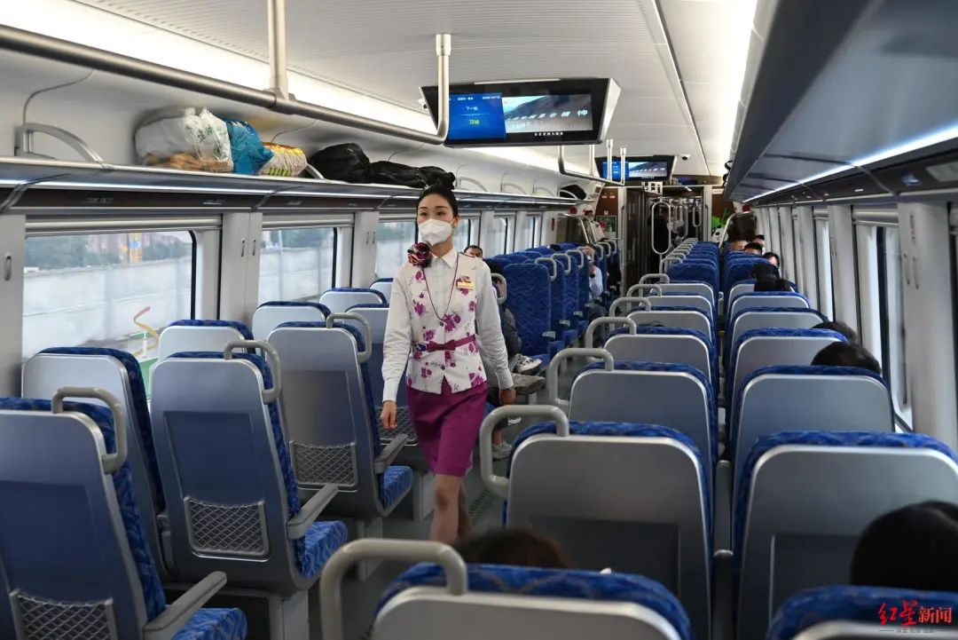 上午9时20分,记者坐上了成都东站前往雅安站的天府号动车组列车。车厢内外加入了新式的涂装,车厢内部也做了许多软化设计。
