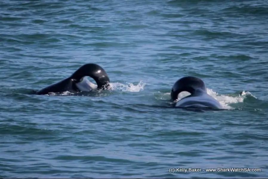 虎鲸左舷与右舷 | Kelly Baker/SharkWatch SA人们发现,在2017年,这对组合出现得格外频繁,而且它们的出现时间总是与大白鲨尸体被冲上岸的时间密切相关。