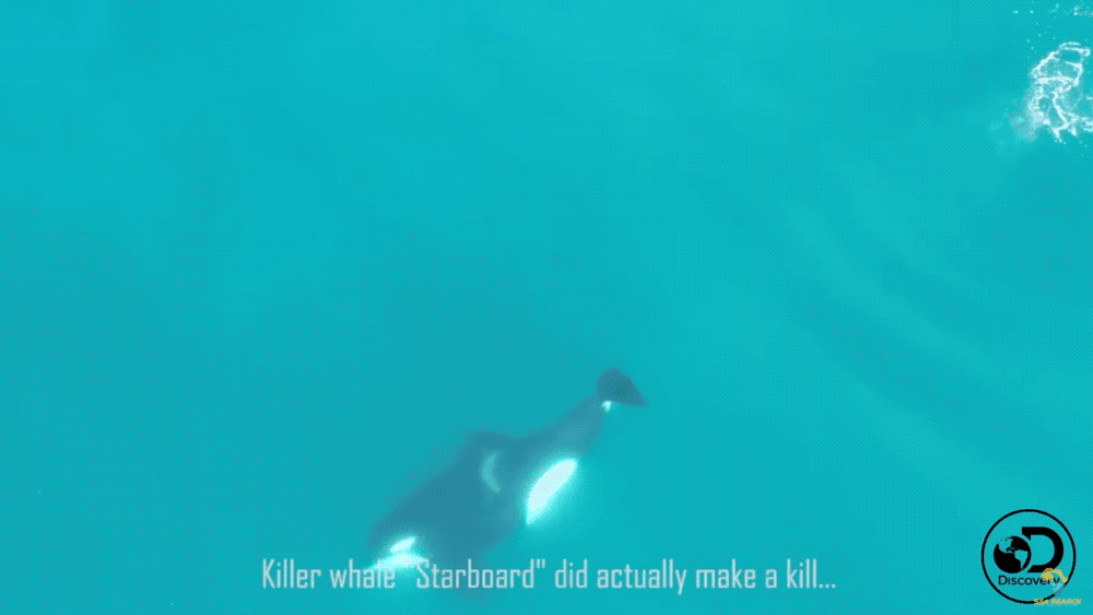 这一次共有5只虎鲸结伴行动——其中一只正是有着塌陷背鳍的“右舷”。在长达71分钟的围猎中,至少有2只大白鲨确认遇害。