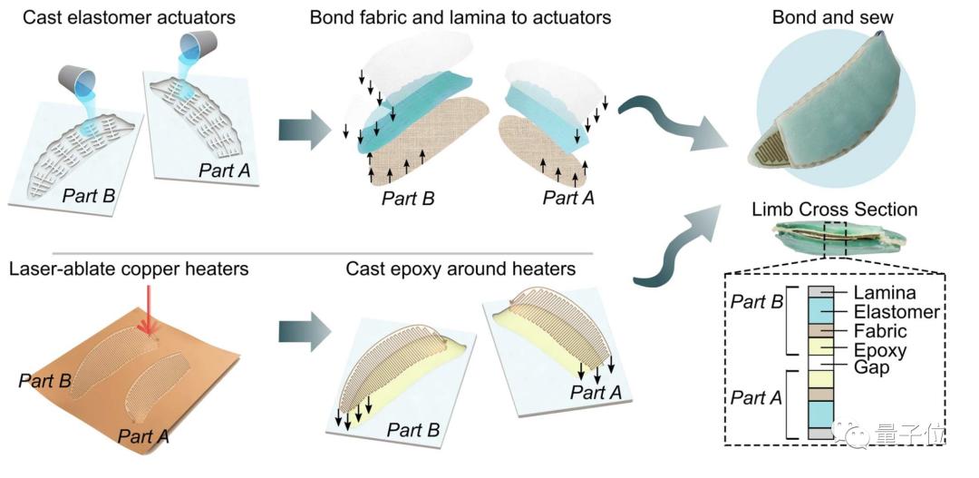当嵌入的加热器加热使其材料软化并给肢体充气,此时肢体的横截面积和硬度都会发生变化。这样一来,它的四肢既可以有适应陆地行走的圆柱形形状,又有利于游泳的平鳍形状。还跟动物做了比较