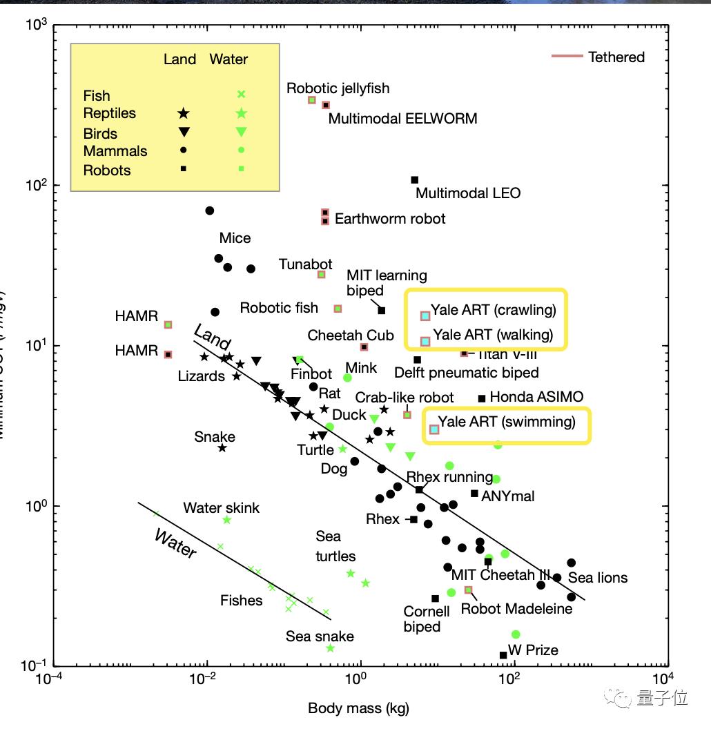 除此之外,科学家还与其他陆生水生动物和机器人做了比较,针对单个环境,ART的表现跟最先进的单模态——水生或陆生的机器人相近,甚至某些情况还超过了后者,以及还超过了一些动物。(狗头)