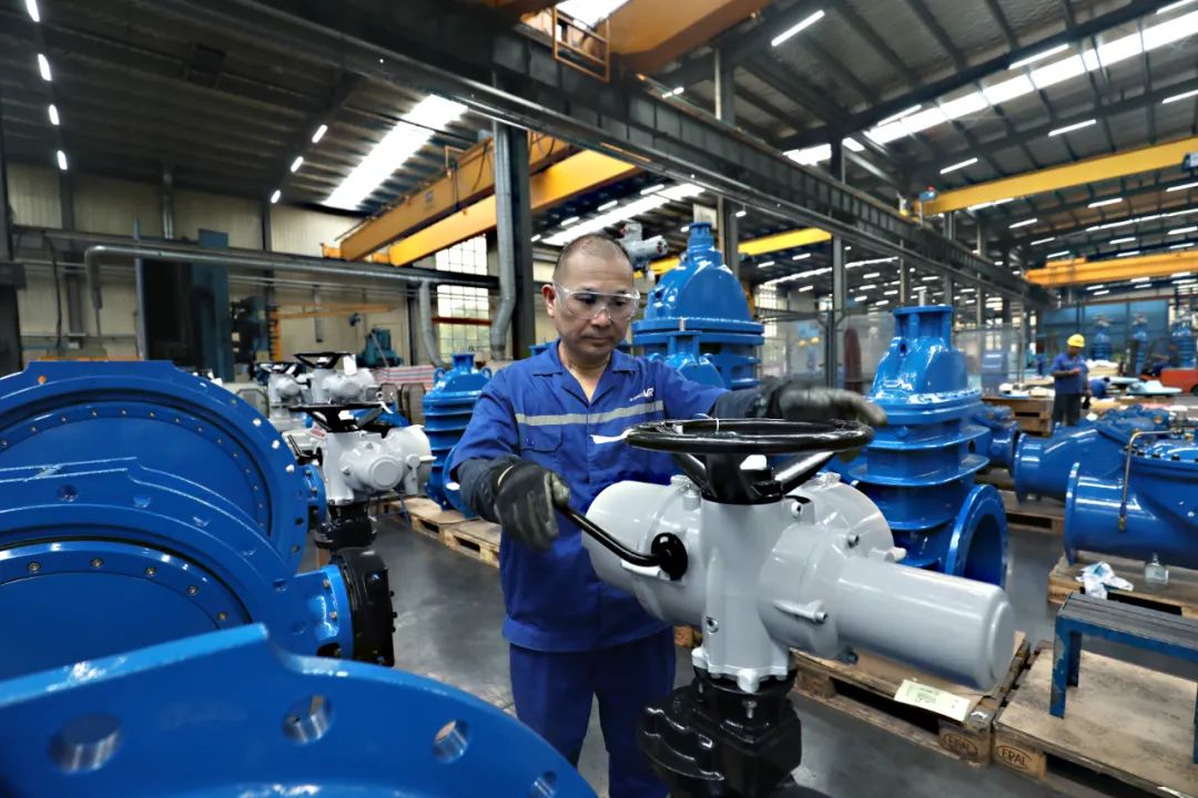 整洁明亮的车间里,埃维柯阀门(安徽)有限公司的工人们正在对一批蝶阀进行校准;而厂房另一侧,整齐排列了一组最大直径3.4米的蝶阀,即将用于杭州亚运会会场建设。