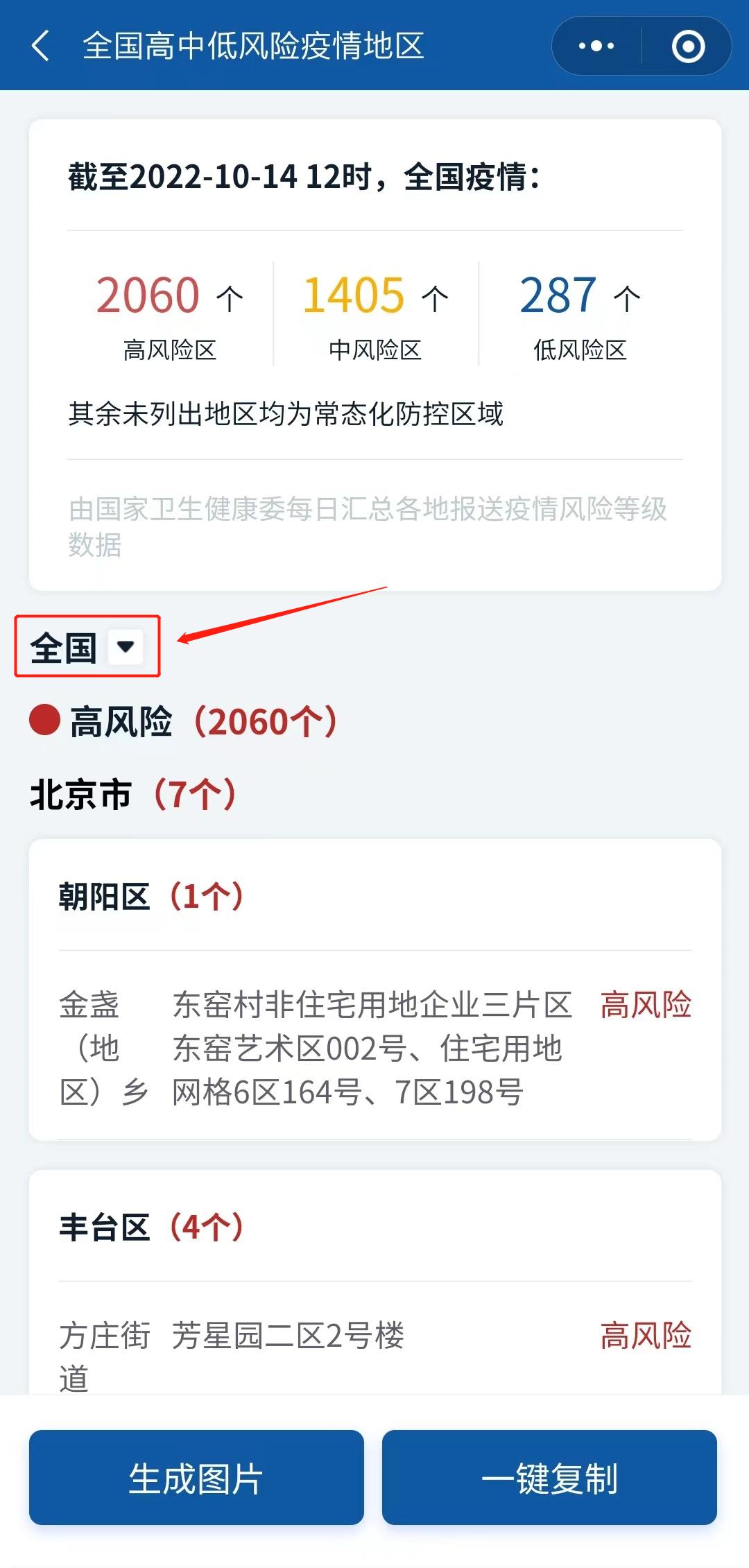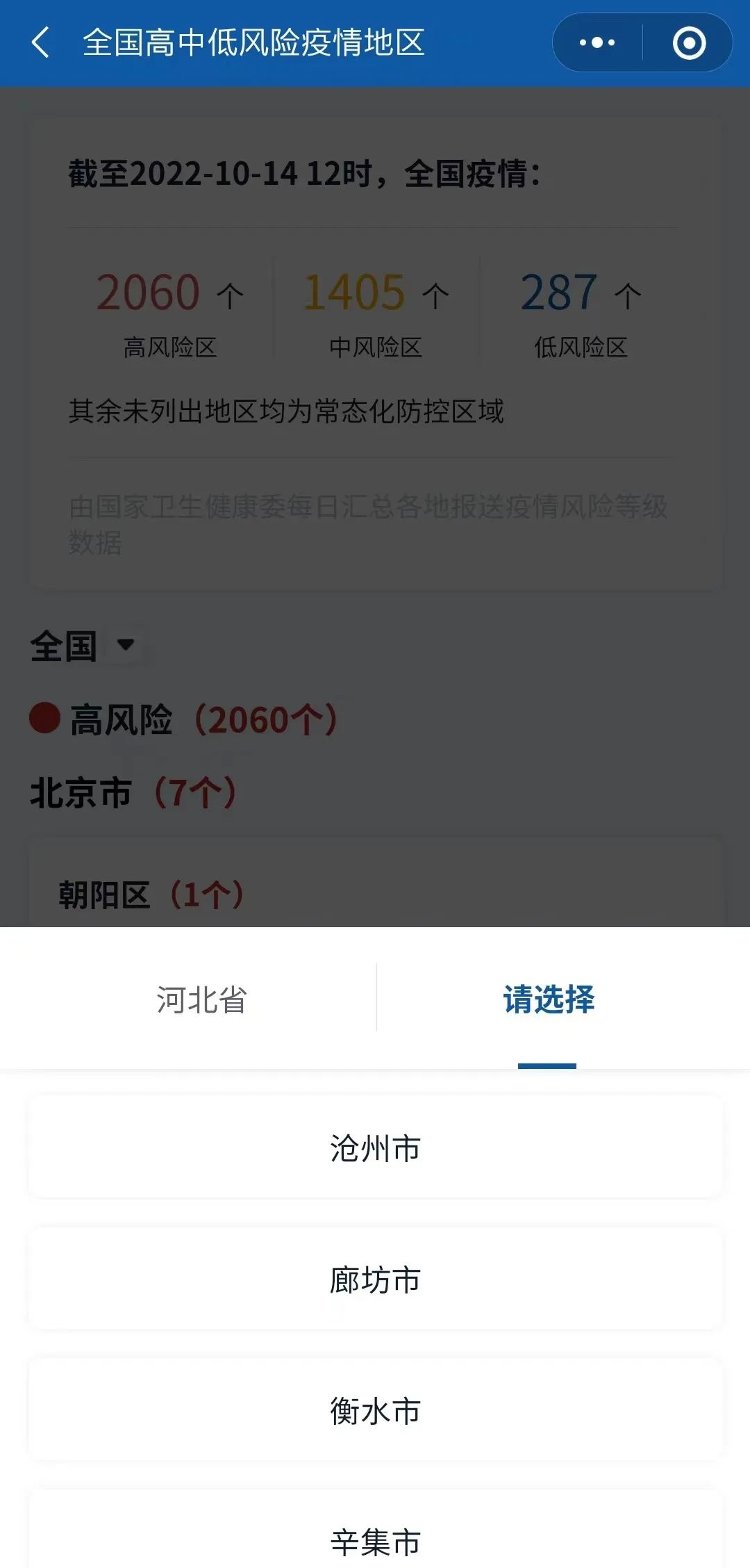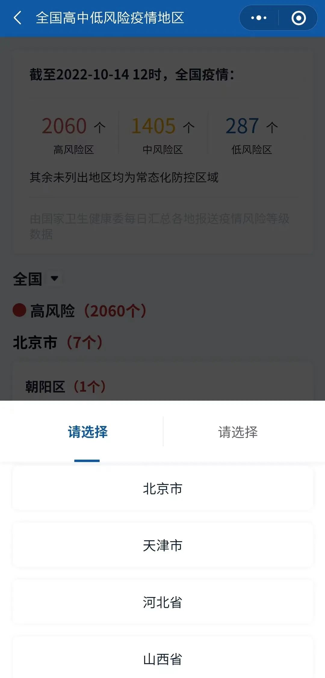 (点击可查看大图)选好后,就可以看到该市(区)的最新中高风险疫情地区名单了。