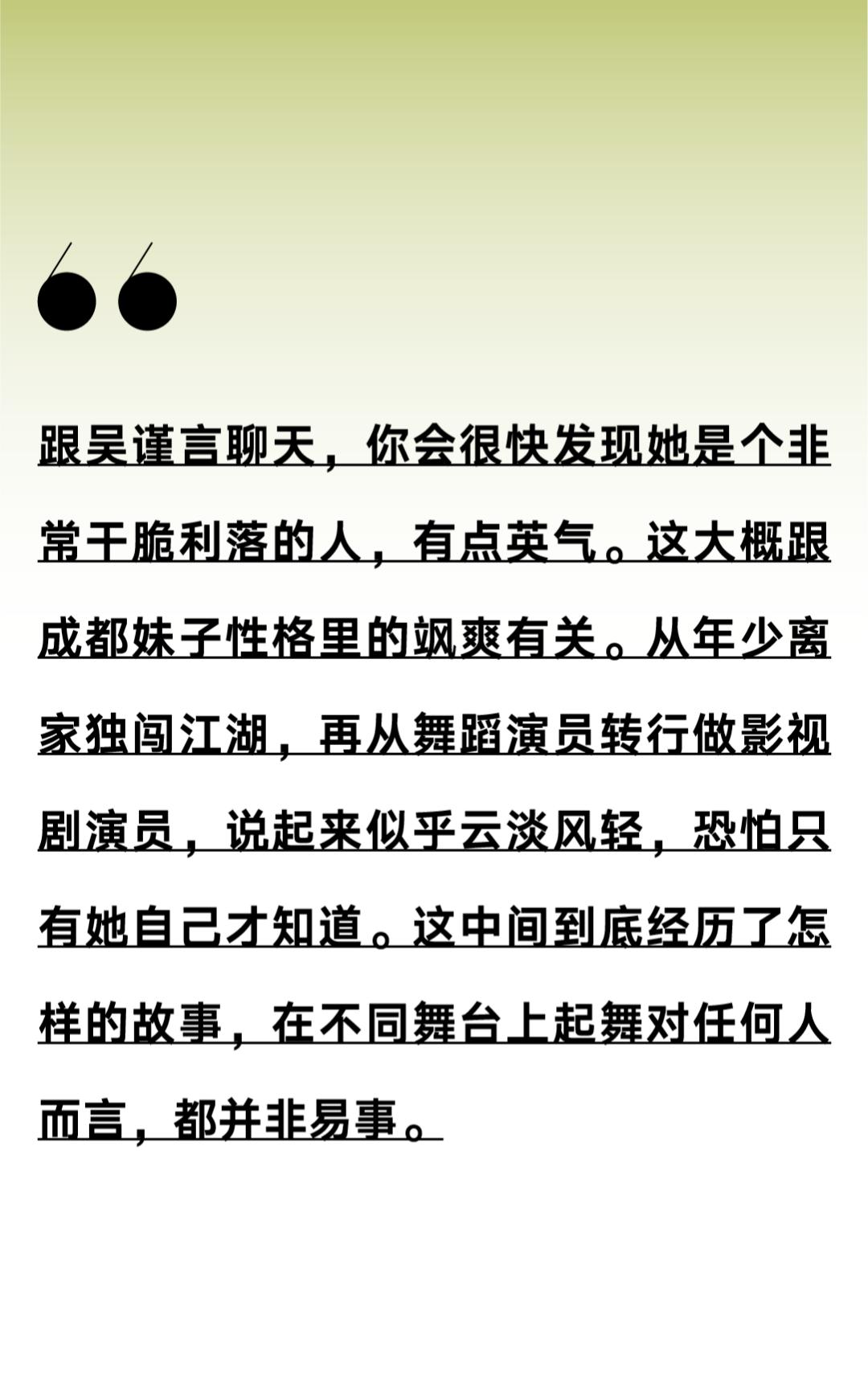 12年像是一个轮回,又像是一次重生。时间退回当年,出身普通人家的吴谨言由父母领着,开始学习舞蹈。“从几岁就开始学跳舞。那会儿还小,还不知道问问自己热爱不热爱,也理解不了要不要把它当作未来的理想和事业这样宏大的概念。”吴谨言这样跟我形容起自己当年做舞蹈演员的生活。像所有小孩都读的课外班一样,她从幼年时就开始了舞蹈学员的生涯。10岁,她就从成都考到北京,不得不说女孩吴谨言在舞蹈上的条件是拔尖儿的。可到了北京的舞蹈学校,才发现佼佼者甚多。“身边都是各个地区选来的优秀学员,我突然觉得自己好像也不算那么好的了。我开始拼命努力,生怕给人家落在后头。”