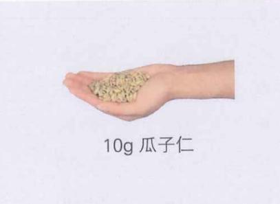 像下图这样的一把瓜子仁约为 10 克,脂肪含量为 5.2 克,而一瓷勺烹调油约为 10 克。所以 1 把瓜子=1 勺油的说法有些夸张了,大约也就是半勺油,如果手比较大,倒是可能达到 1 勺油的脂肪。
