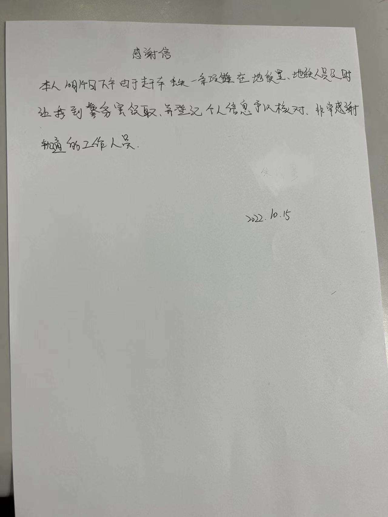 10月14日15时许,合肥轨道交通3号线窦桥湾站,轨道公安执勤辅警巡逻发现一条金项链,随即将其捡起带往警务室进行查询,视频显示项链掉落时,有多位乘客同时经过该区域,不能确认是谁丢的项链。于是逐个打电话询问,在打到第六个电话时,终于联系到失主。10月15日8时许,失主领回遗失的金项链,并写下一封感谢信。