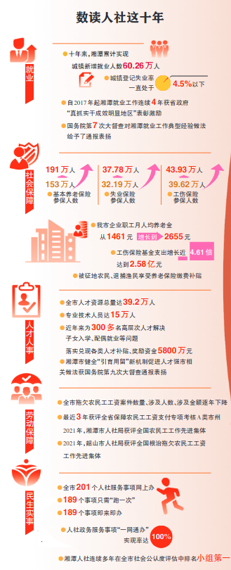 2012年以来,湘潭累计实现城镇新增就业人数60.26万人;基本养老保险、失业保险、工伤保险参保人数分别从153万人、32.19万人、39.62万人增加到191万、37.78万、43.93万人;目前人才资源总量达到了39.2万人;全市拖欠农民工工资案件数量、涉及人数、涉及金额逐年下降。这串民生“硬”数据背后,凝结着湘潭人社整整10年的政治担当和辛劳汗水——