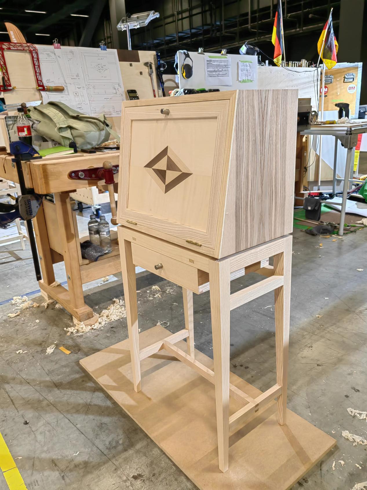 李德鑫:本次特别赛一共有62个比赛项目,我参加的是其中的家具制作项目。比赛前一个月,会公布一套备选题;比赛前一天,各参赛国的专家再一起对备选题进行30%的改动,产生一套新的比赛题目。比赛开始,就把比赛题目的图纸发给选手,选手有一个小时时间琢磨图纸,然后在规定的4天内(一共22个比赛小时),把一堆原材料,制作成一件符合图纸要求的完整家具作品。这次比赛是一张立式柜的图纸,除了箱体、脚架、抽屉、门板等制作工序,还要进行贴皮、打磨、组装、修整以及五金件安装,才算最终完成。