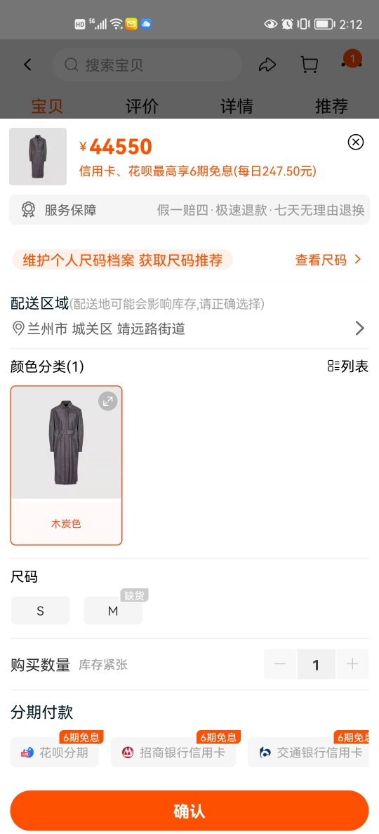 记者发现,这款风衣只有S码和M码,虽然没有售出一件,但显示“本店收藏第一名”,而且购买数量提醒:因库存紧张只能购买一件。该店铺还显示,会员可享优先预购新品、指定商品分期免息、一对一专属客服等权益。