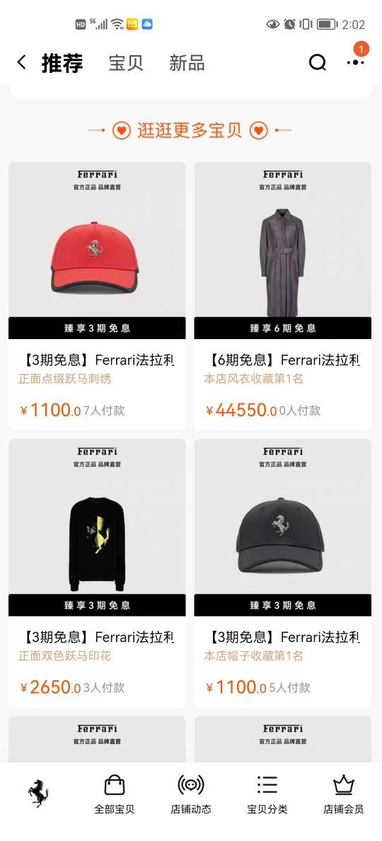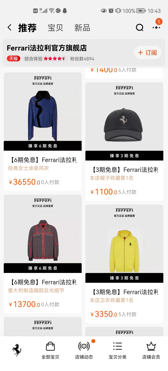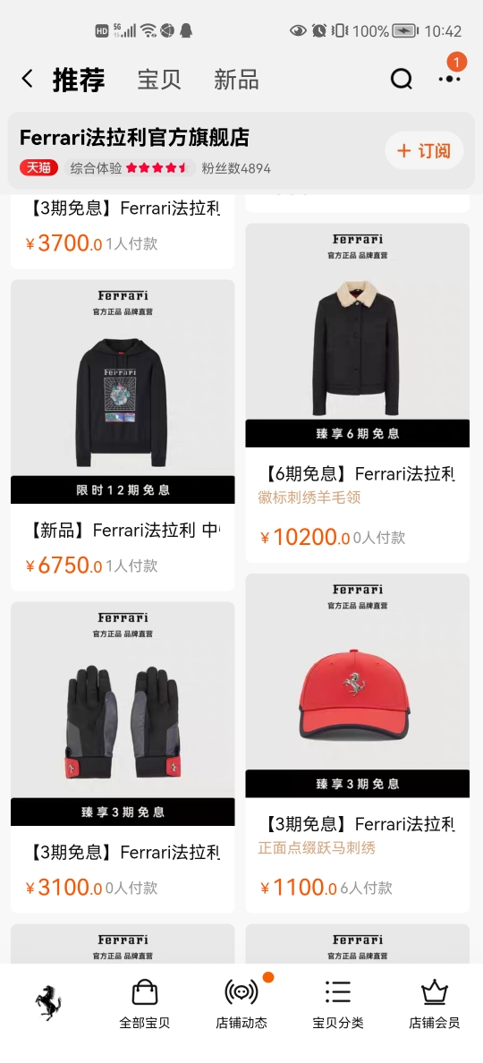 奔流新闻记者在法拉利开设在天猫的官方旗舰店看到,目前有明星单品、女士成衣、人气配饰、人气包款四大品类的产品,包含一些秀场同款,售价从630元至4.45万元不等。目前售价最贵的是一件灰色的女士中长款风衣外套,标价为4.45万元。