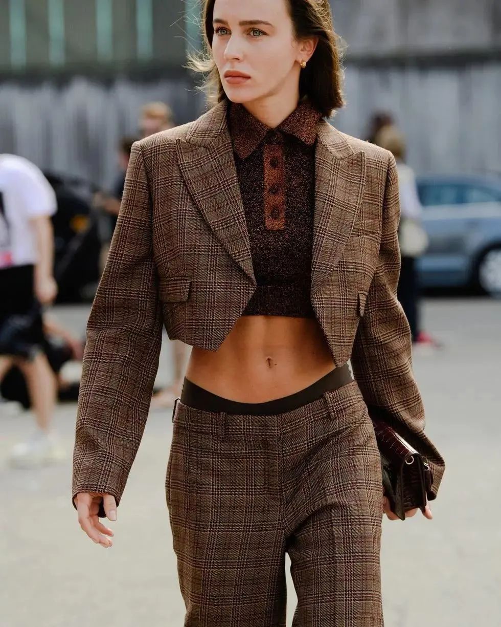 今年流行的垫肩元素与格纹西装结合,沉稳大气又优雅!