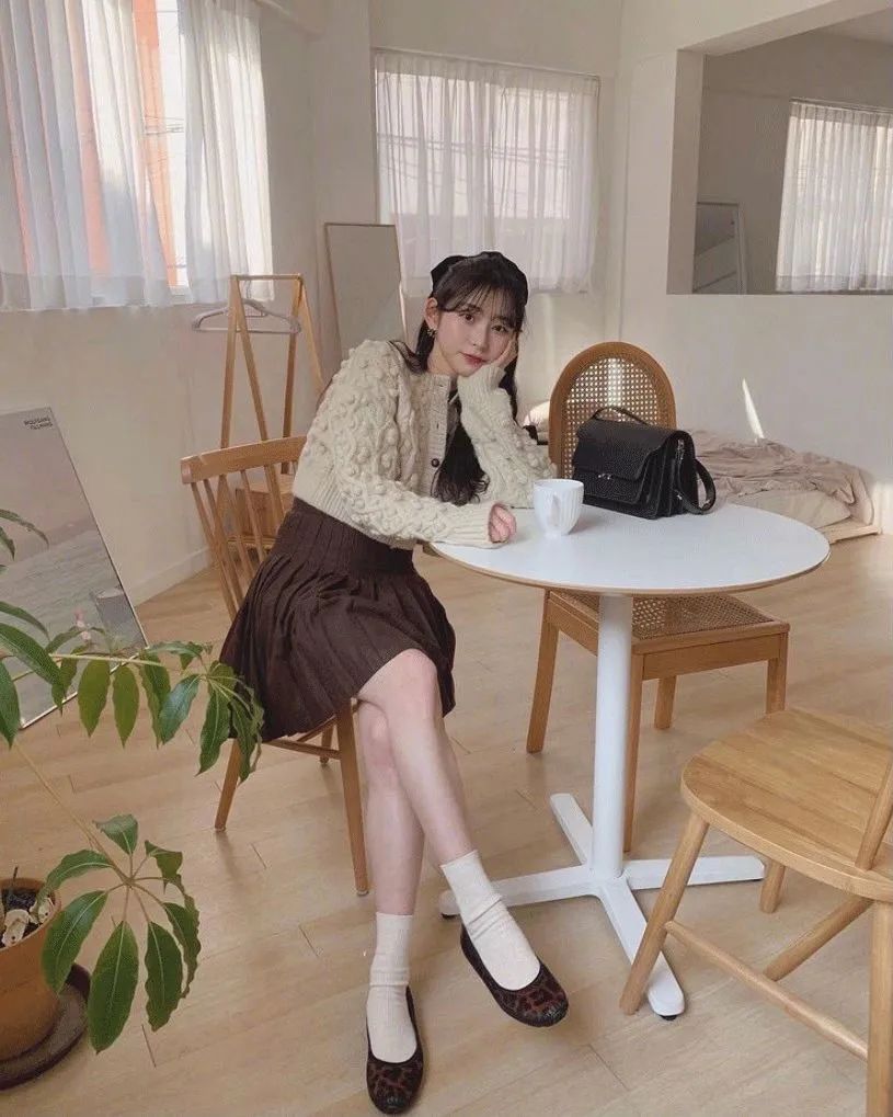 选择粗棒针针织开衫搭配百褶短裙,有一种怀旧文艺少女感,复古与减龄并存。