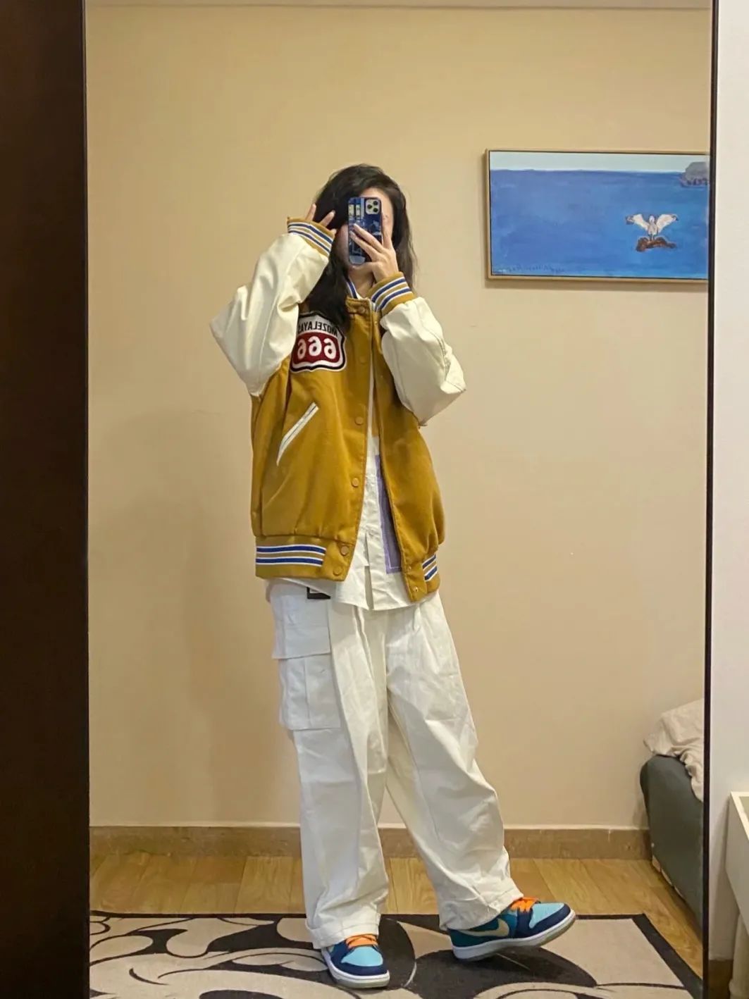 棒球服搭配卫裤、工装裤都很合适,再穿上一双运动鞋,就是很运动休闲的一身搭配。