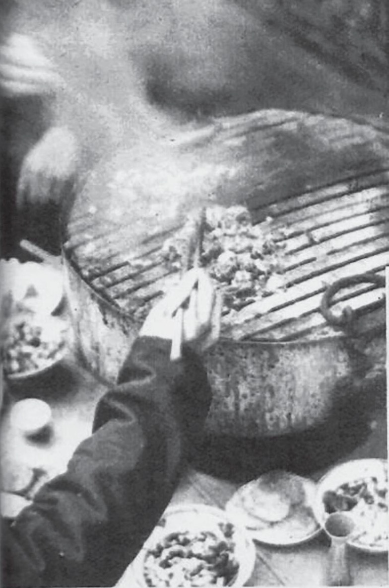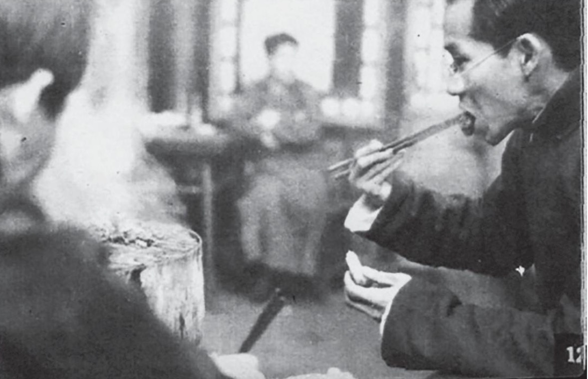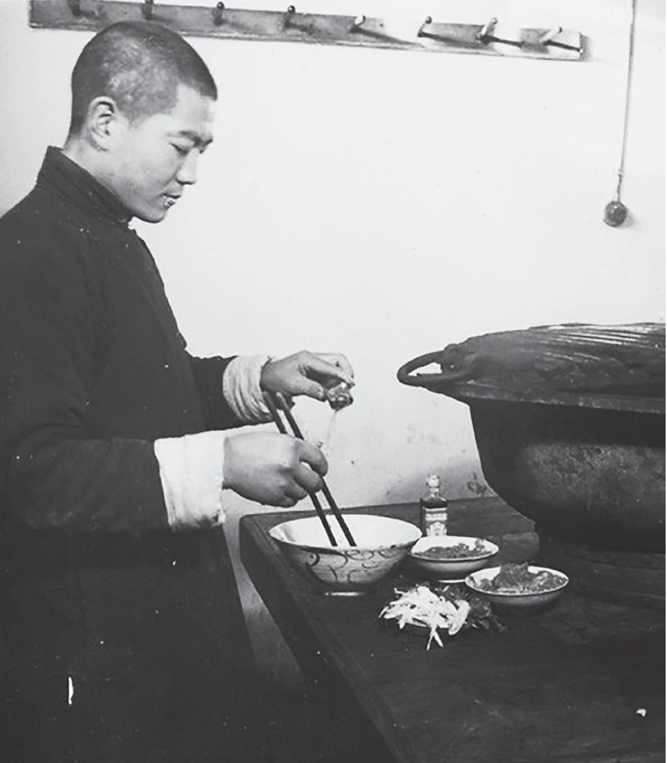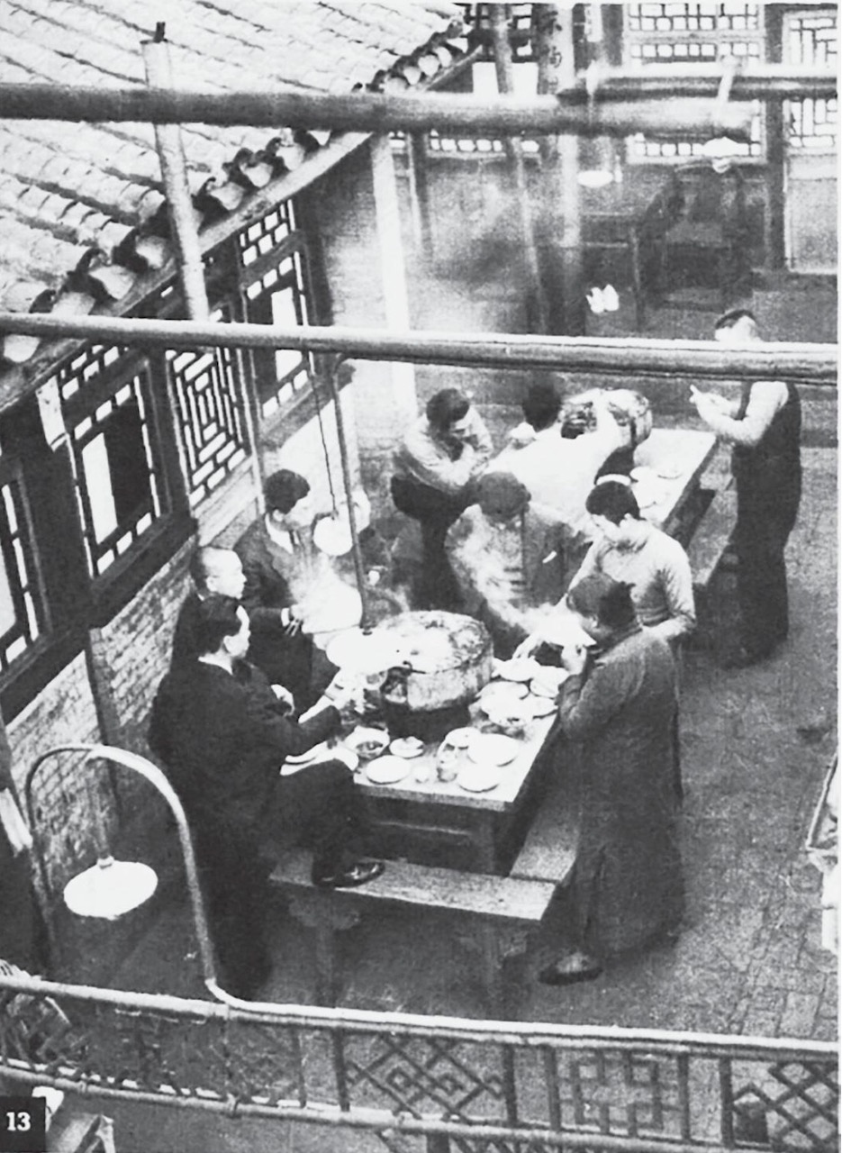 日本人把炙子烤肉称为“成吉思汗锅”。当时最正宗的吃法——“武吃”,得站着吃。图为日本记者安保久武拍摄的正阳楼中庭吃烤羊肉的食客。 本文历史图像由吴真、哈佛燕京图书馆 提供