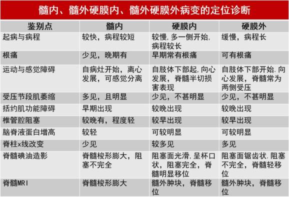 图1 脊髓病变的诊断思路(作者原创)表1 髓内、髓外硬膜内、髓外硬膜外病变的定位诊断(作者原创)