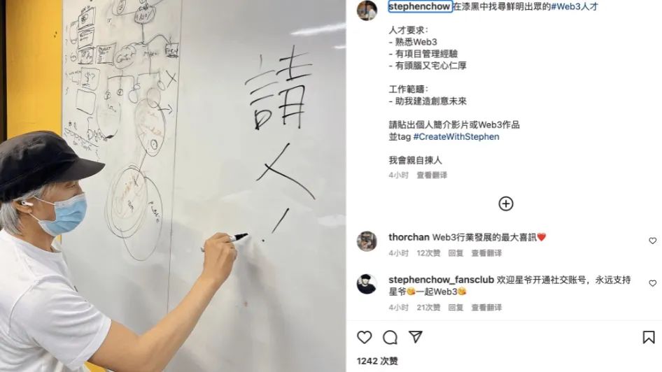虎嗅从知情人士处获悉,从去年下半年开始,周星驰便已经为进入NFT行业做准备,但由于种种原因未能真正入局。10月18日晚,周星驰终于朝Web3迈进重要一步,他注册了Instagram号,并在这个社交媒体上发布了第一条动态:招Web3人才。人才要求:熟悉Web3、有项目管理经验、有头脑又宅心仁厚。