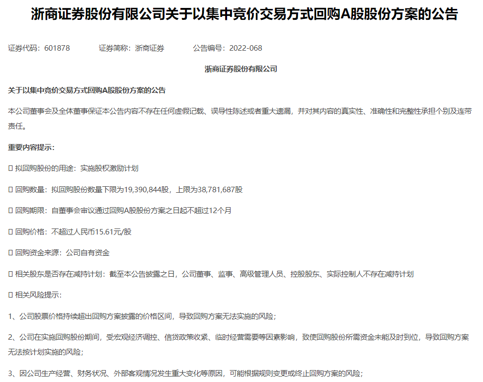 关于此次回购股份的目的,浙商证券表示,为积极响应国家政府和监管部门的政策导向,增强投资者信心,维护股东权益,同时,积极推进国有企业混合所有制改革,建立员工与公司利益共享、风险共担的市场化机制,进一步激发公司活力,提升市场竞争力,公司拟回购A股股份,作为实施股权激励计划的股票来源。