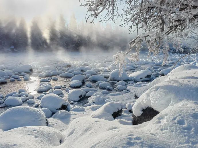冬日的喀纳斯他问我:“你见过冬天的河水吗?早上太阳升起后气温会升高,河面上有一种热气缭绕的感觉。空气中的水汽凝结后,会产生冰晶。它们看着像一朵朵雪花一样,其实那东西叫钻石尘。”