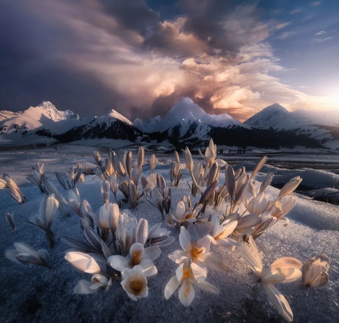 他依稀记得,那天刚下过暴雨,他跑出去取景。远处是苍茫的雪山和落日的余晖,近处有覆盖着薄薄积雪的小山坡,而脚边盛放着白色的花。