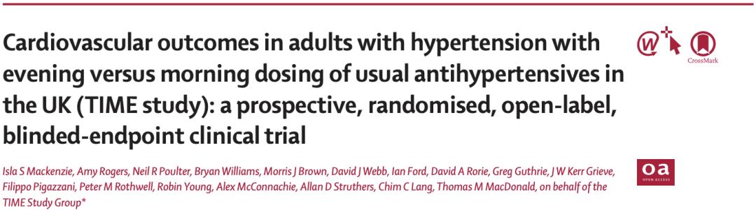 [2] Mackenzie IS, Rogers A, Poulter NR, Williams B, Brown MJ, Webb DJ, Ford I, Rorie DA, Guthrie G, Grieve JWK, Pigazzani F, Rothwell PM, Young R, McConnachie A, Struthers AD, Lang CC, MacDonald TM; TIME Study Group. Cardiovascular outcomes in adults with hypertension with evening versus morning dosing of usual antihypertensives in the UK (TIME study): a prospective, randomised, open-label, blinded-endpoint clinical trial. Lancet. 2022 Oct 11:S0140-6736(22)01786-X. doi: 10.1016/S0140-6736(22)01786-X. Epub ahead of print. PMID: 36240838.