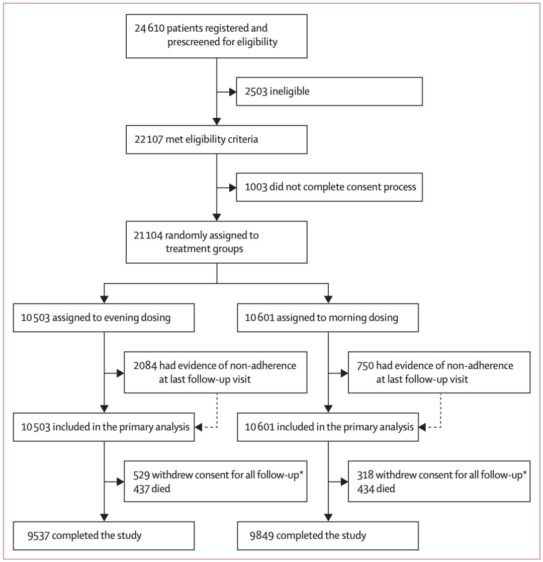 2011年12月17日-2018年6月5日期间,共有24610例患者参与筛选,21104例完成随机分组。参与者平均年龄65.1岁,女性占比42.5%,白人占比为90.5%。在中位时间为5.2年的随访期间,夜晚服药组首要结局事件的发生率为3.4%(362/10503),而早晨服药组则为3.7%(390/10601)。