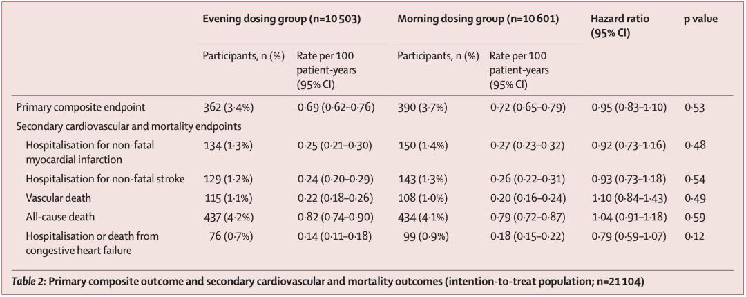 夜晚服药组每100人年的随访中有0.69例事件发生,而早晨服药组则为0.72例,二者相比并无显著差异(风险比0.95,95%CI:0.83-1.10,P=0.53)。