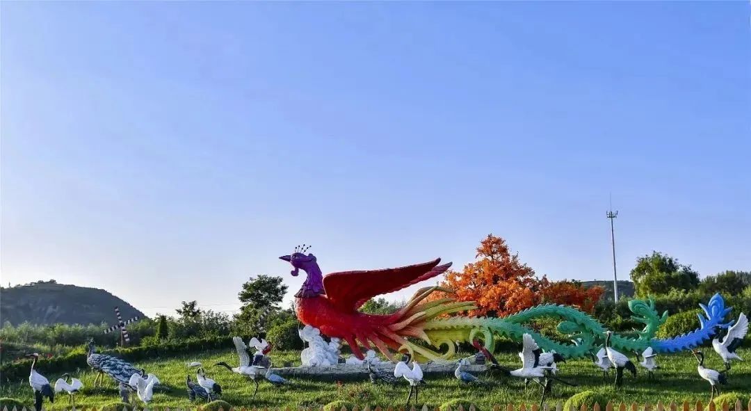 首站,选择了离县城最近的凤凰村。凤凰,百鸟之王,寓意吉祥和谐。凤凰村山下沟水清澈,绕山流入泾河,植被葱绿茂密,春夏秋三季遍山花果。走进村内,一座万紫千红、鸟语花香的生态花卉园映入眼帘。在园林中央,凤凰与百鸟展翅欲飞。我穿行于村落郁郁葱葱的花海林木间,伴随着隐约的潺潺水流,仿若置身江南水乡、世外桃源,让人流连忘返。