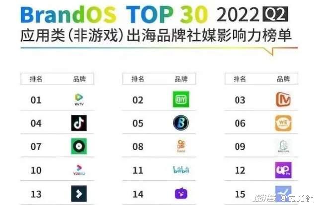 喜忧参半,多元内容突围今年8月发布的《BrandOS TOP 100出海品牌社媒影响力榜单》上,腾讯视频WeTV、爱奇艺国际版iQIYI与芒果国际版MangoTV分列2022 Q2应用类(非游戏)榜前三位。在总榜上,WeTV更是取代了蝉联三期第一的游戏“原神”,跃至榜首。