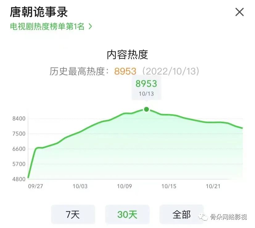 9月27日开播的《唐朝诡事录》连播16天完结,播放周期正好包含整个十一假期。剧集开播首日,爱奇艺站内热度还不到5000,但却在之后每天尤其是十一假期期间热度持续增长,直至剧集完结次日达到峰值8973,几乎冲破9000大关。完结后近两周,热度依然保持在8000以上,长尾效应显著,成为今年网剧的黑马剧集之一。