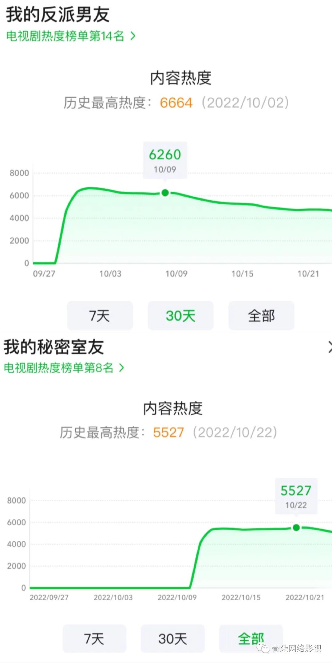 《苍兰诀》之后,“恋恋剧场”的剩余三部24集短剧都选择以日更方式播出。9月30日开播,播放周期同样覆盖整个十一假期的《我的反派男友》,在开播第三天爱奇艺站内热度达到峰值6664,之后的会员更新期热度仍保持稳定,完结日有所回升至6260,留存效果较好。一周后开播的《我的秘密室友》播出期站内热度走势几乎保持一条水平线,并在后期小幅上涨,最终在完结日达到最高热度5527。