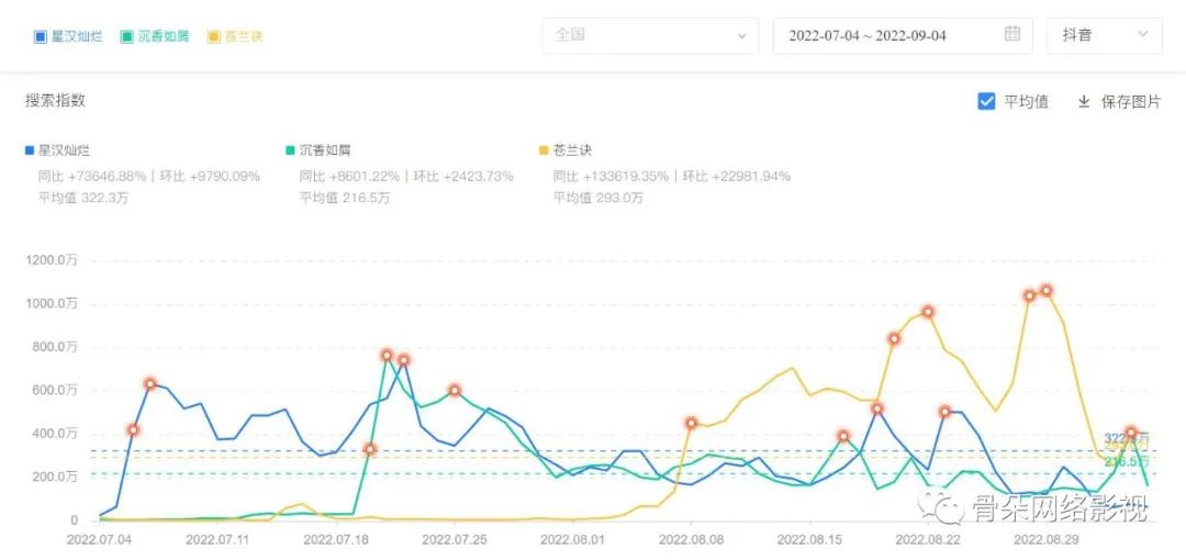 在今年暑期档三大古偶剧《苍兰诀》《星汉灿烂·月升沧海》《沉香如屑·沉香重华》的同台对决中,最晚开播的《苍兰诀》是三部剧中首播时表现最弱的一个,抖音指数比后两部剧相差不少。但在首周10天连更24集后,经过三天间歇期的发酵,《苍兰诀》在次周首个更新日8月20日开始抖音指数走势大涨,并在21日迎来首个小峰值964.5万,最终在完结日迎来抖音指数最高值1063万。